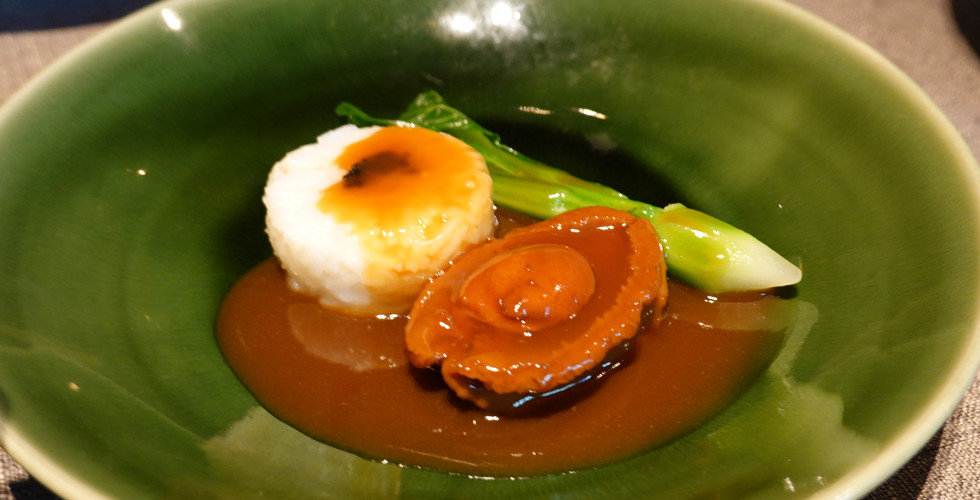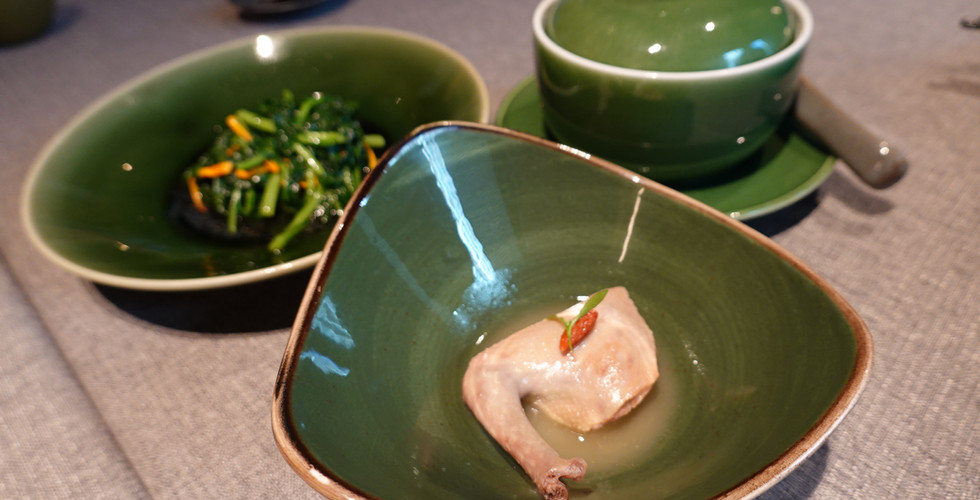 The menu unfolds with a sense of quiet restraint, favouring clarity over complexity. A single cut of tender poultry rests in a lucid, gently perfumed broth, while delicately steamed white fish is finished with aromatic oil and chopped herbs, its natural sweetness left intact. Slow-braised abalone, paired with seasonal greens, brings depth and umami without excess, followed by fine noodles submerged in a pale, velvety broth, lifted by the subtle smokiness of grilled meat. A cool counterpoint arrives in the form of marinated seafood set atop crisp cucumber, accented with a measured touch of Sichuan pepper and chilli oil. Throughout, flavors are precise and unhurried, revealing themselves gradually rather than demanding attention.