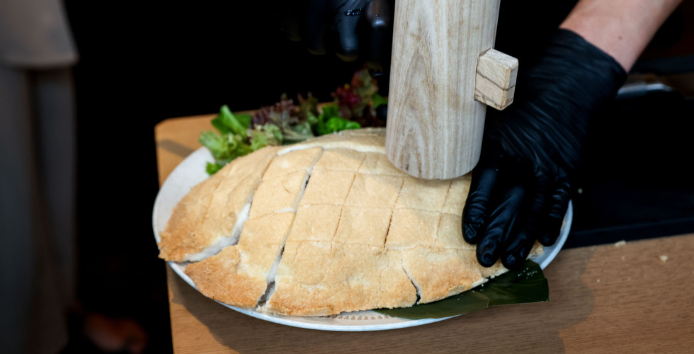 The afternoon’s most cinematic moment arrived with KOUBAI’s Shiogama Hoba-yaki. In this dramatic preparation, Aka-ushi is wrapped in a Japanese magnolia leaf, sealed in a thick crust of salt, and baked until the aromas intensify beneath the surface. Cracked open tableside, the dish released a billow of fragrance — part forest, part fire — becoming an instant visual and sensory focal point of the launch.