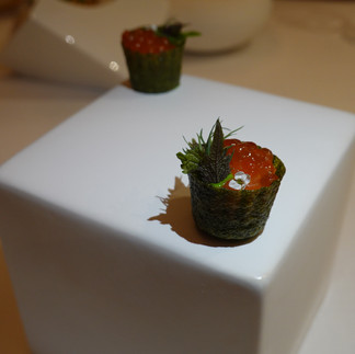 Prugna brings its three elements into harmony. Plum lends a gentle acidity, layered with the herbaceous edge of shiso and the soft, rounded richness of coconut. Light and contemplative, the dish closes the sequence with clarity rather than sweetness.